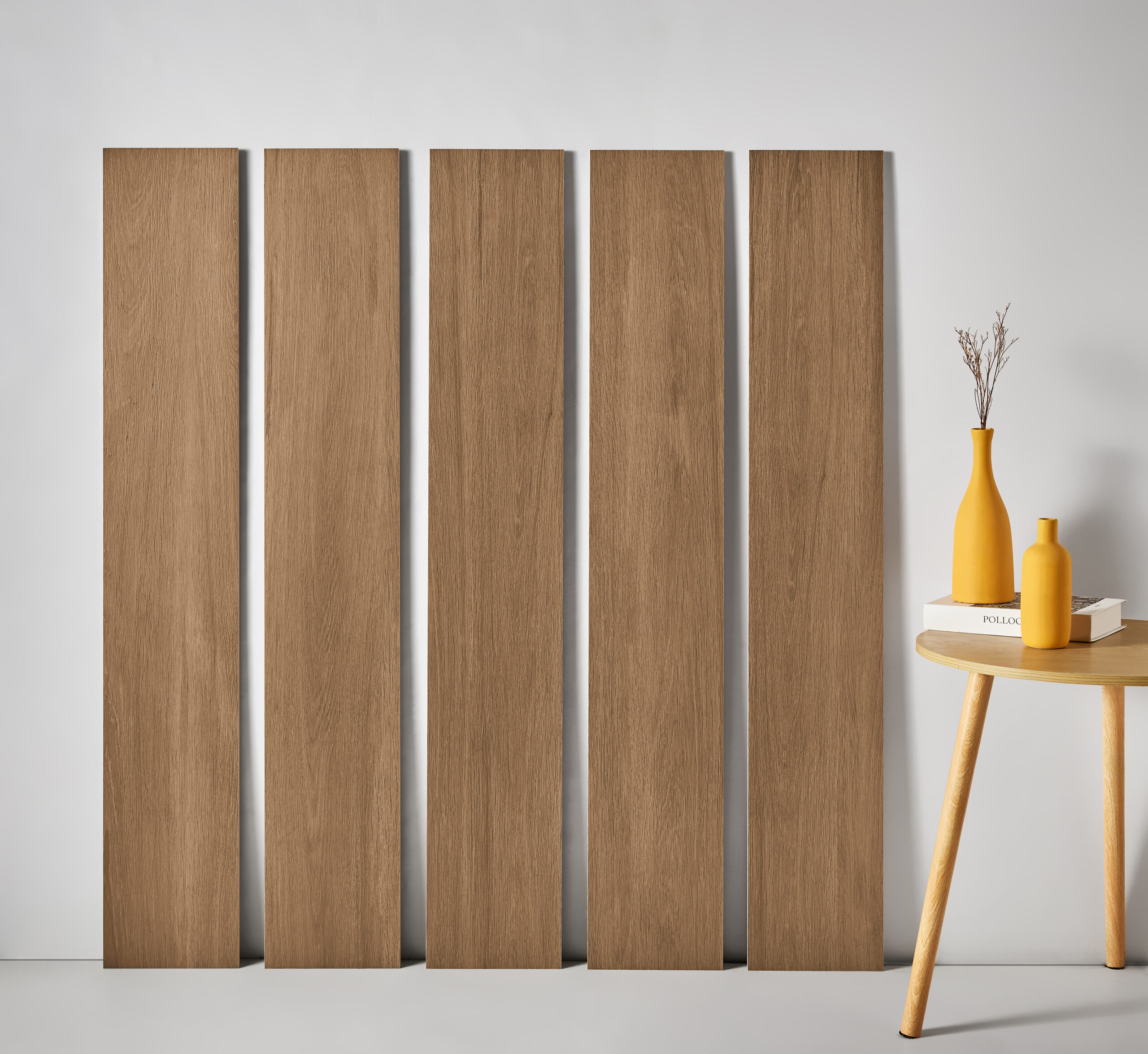 SkeloTile Porcelain Wood-Look Series redefines premium wood-look porcelain tiles with its dual engraved textures, 7° soft matte finish, and Italian ultra-fine dry grain glaze enriched with ≥25% nano-alumina. Inspired by the natural elegance of wood grain, the series delivers lifelike textures with subtle depth, ultra-low water absorption (≤0.018%), and exceptional durability, combining authentic aesthetics with high-performance technical excellence.