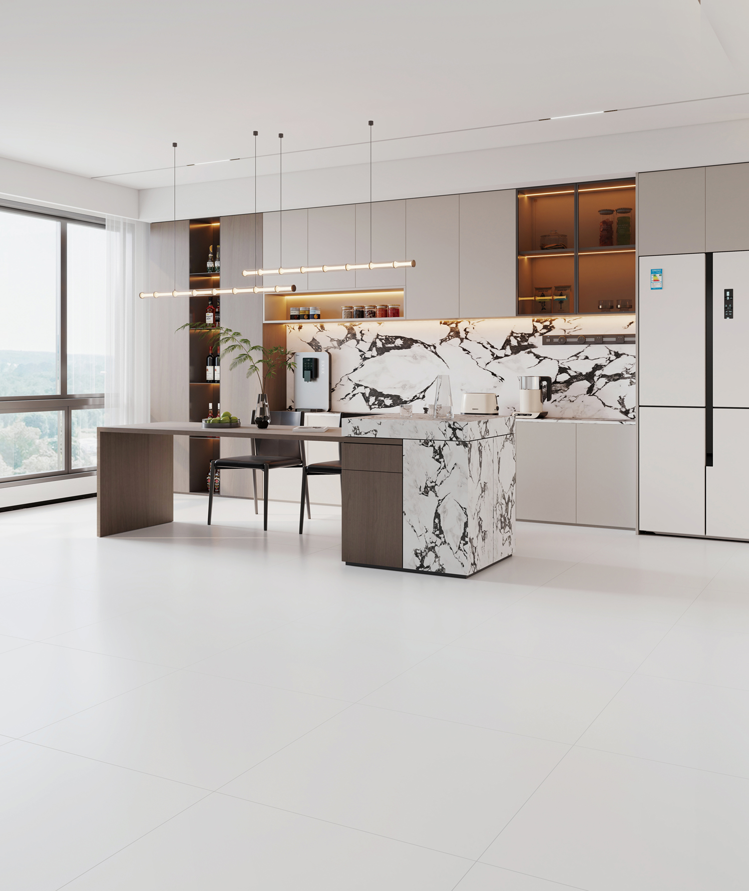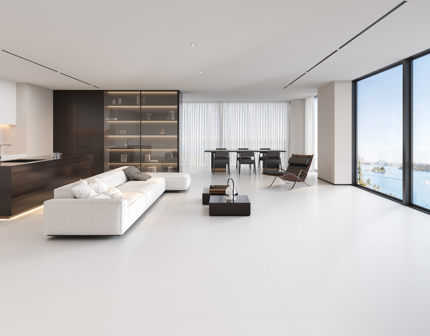 The tile adopts a 58° ultra-white body with high purity, improving color clarity and spatial brightness.