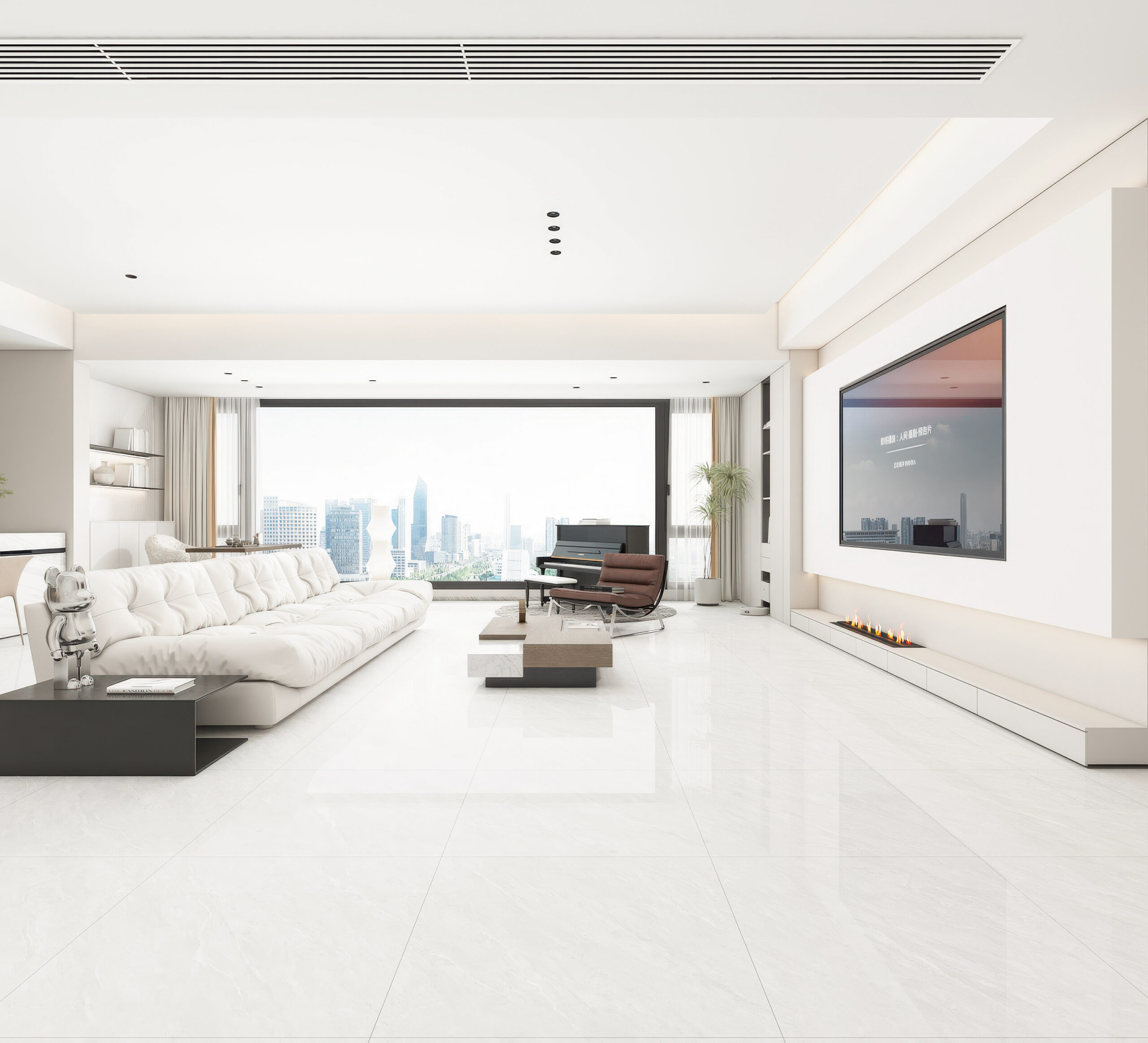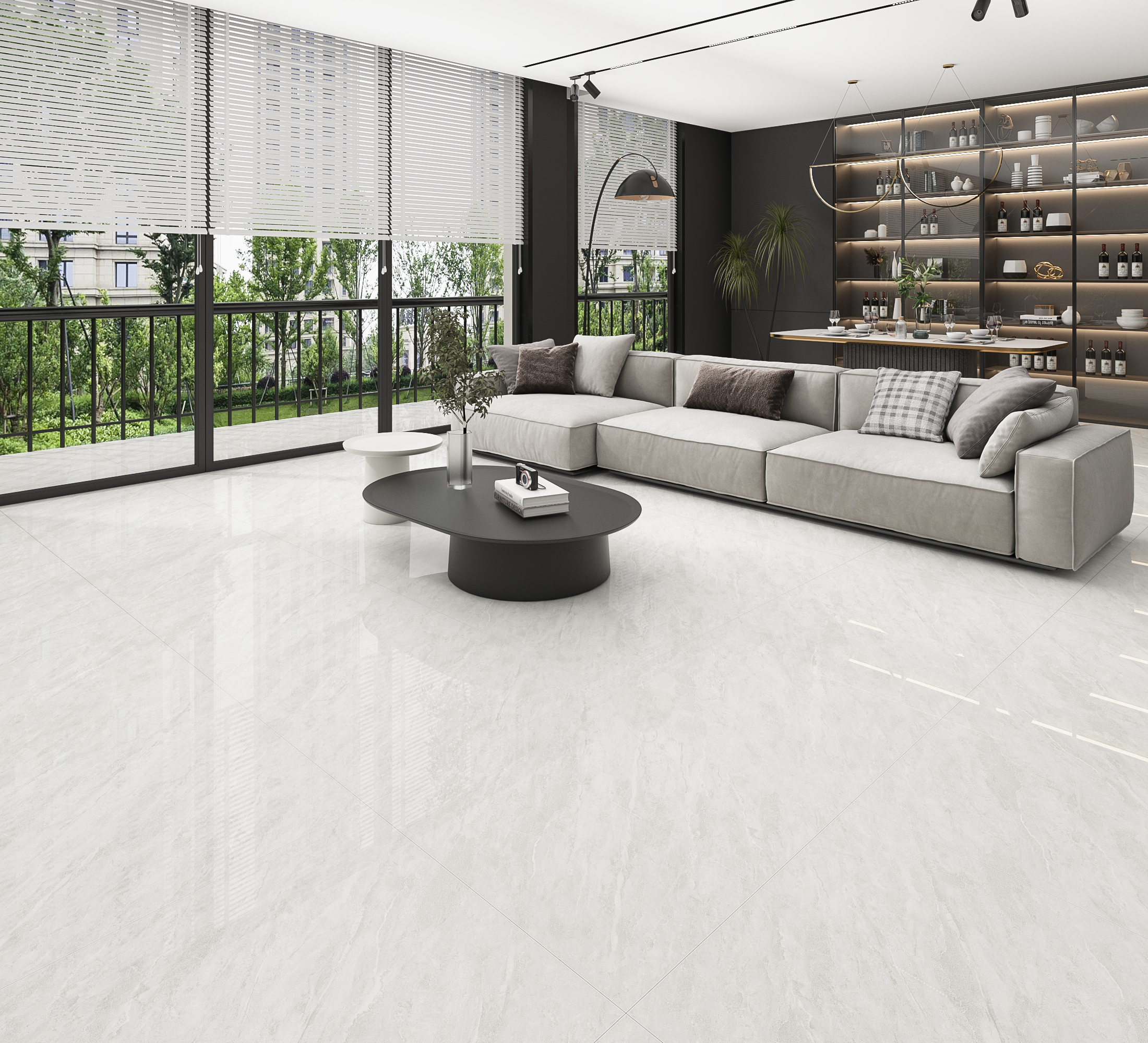 Premium porcelain tile featuring a 45° ultra-white body, super-flat mirror glaze and random continuous veins. Engineered with Spanish imported glaze, nano anti-stain protection and double-zero water absorption for long-lasting clarity, durability and seamless architectural applications.