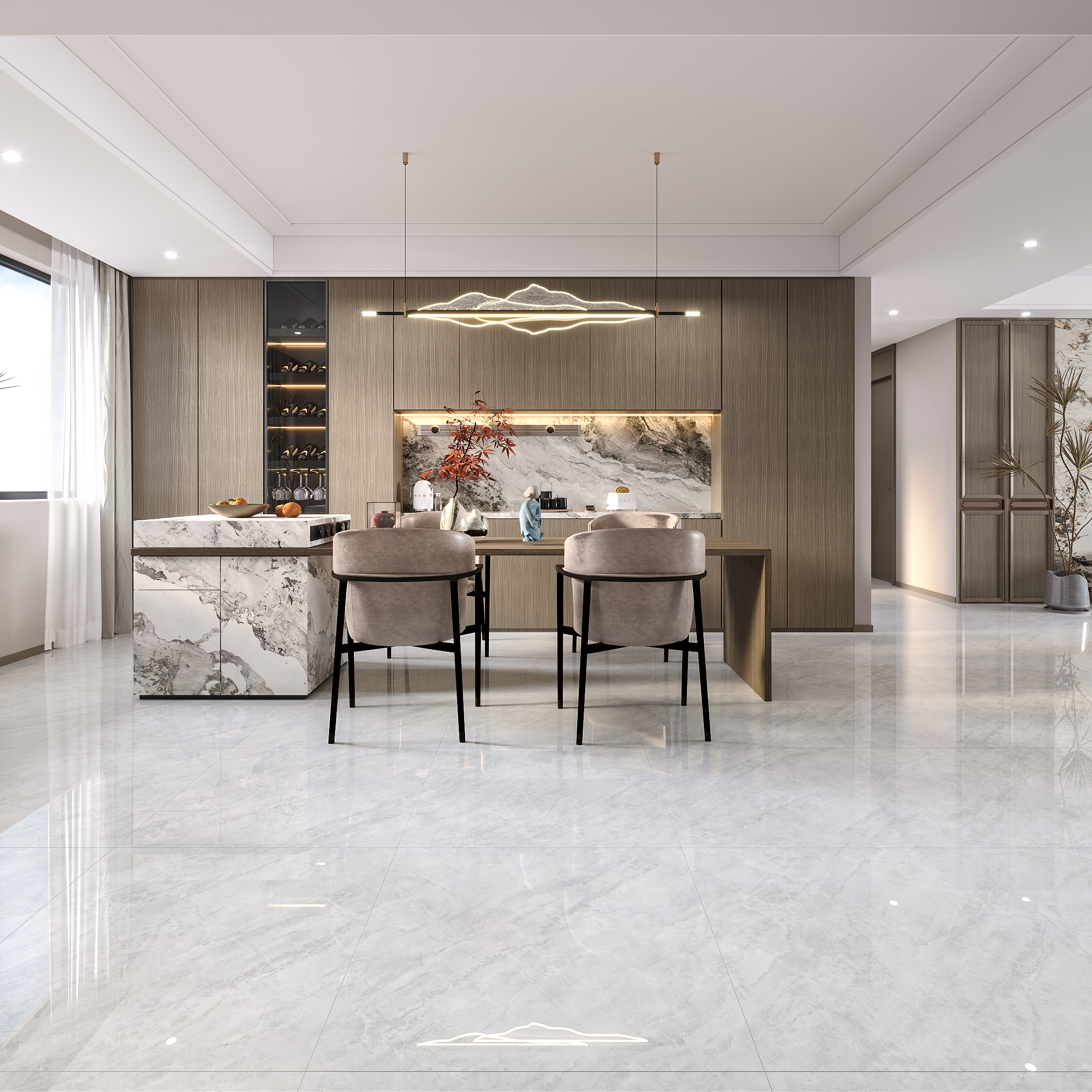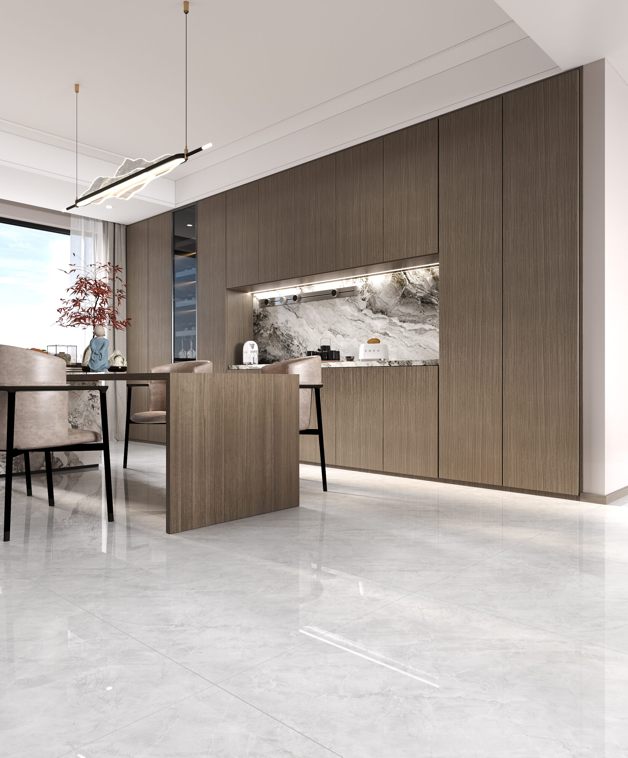 Each design includes multiple independent faces to avoid repetitive patterns. Veins transition smoothly from tile to tile, replicating the randomness of natural marble. Large areas achieve a coherent, expansive visual effect suitable for luxury residences, hotels, lobbies and commercial interiors.