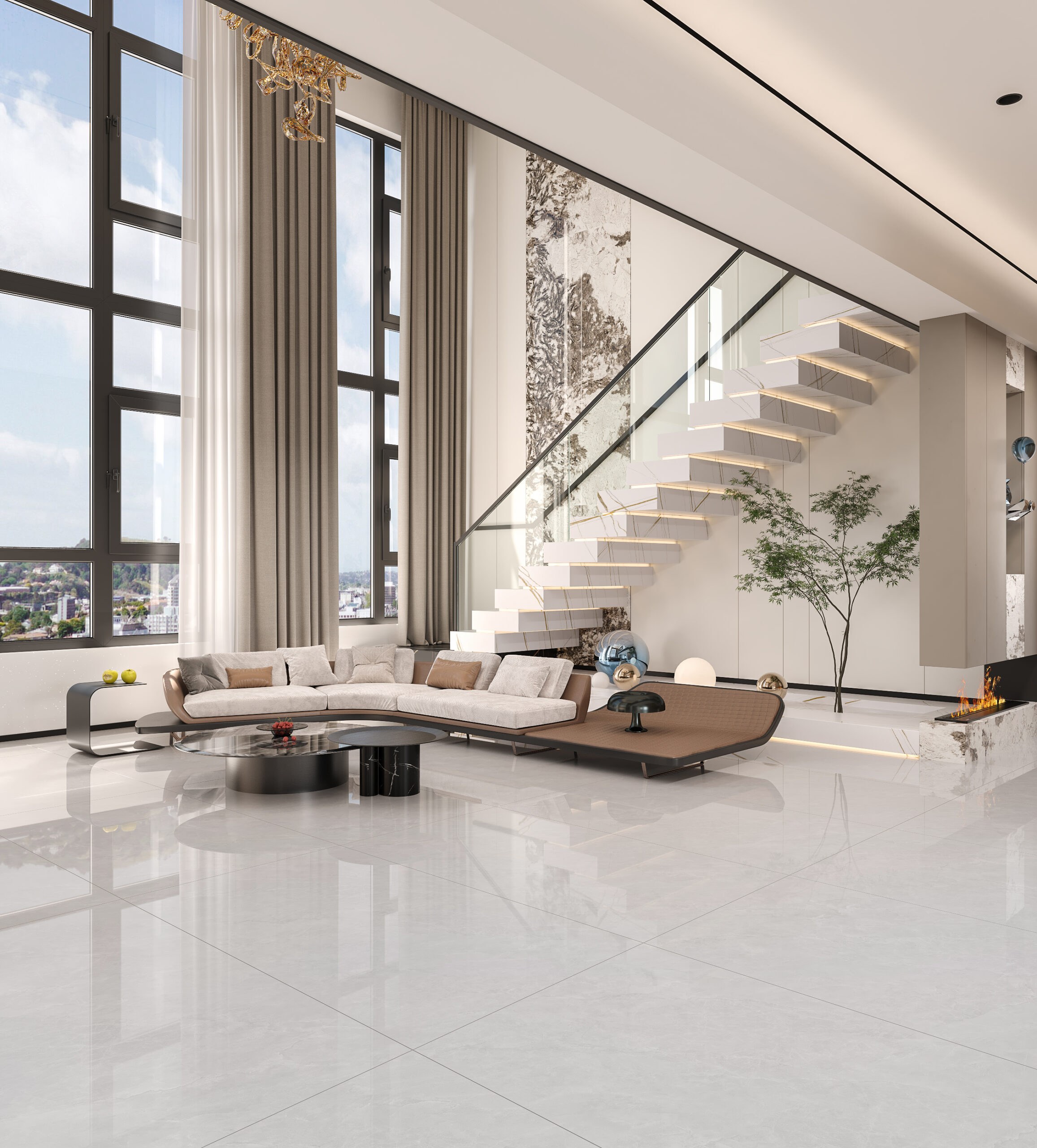 Each design includes multiple independent faces to avoid repetitive patterns. Veins transition smoothly from tile to tile, replicating the randomness of natural marble. Large areas achieve a coherent, expansive visual effect suitable for luxury residences, hotels, lobbies and commercial interiors.